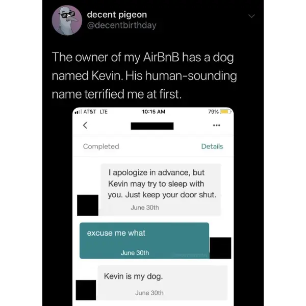Kevin the dog: I like Stephen Wright’s joke of naming his dog “Stay” so he could say, “Come here, Stay!”